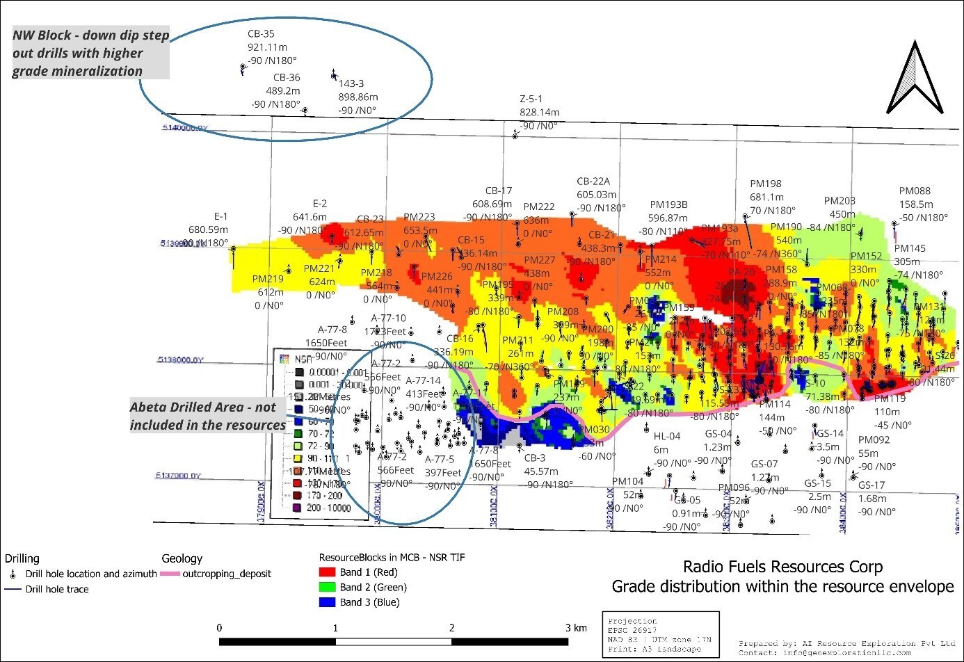• The 2024 work program yielded several positive outcomes. The core re-logging confirmed and expanded upon the historical understanding of the geological setting, highlighting the potential for higher-grade uranium mineralization controls and mineralogical associations. The study confirmed that the uranium resource envelope is open along strike and down dip. The study also suggests that the uranium grade continues downdip and generally increases in grade. This is demonstrated by a major step out (not included in the resource) where historical hole CB-35, drilled about 1,400m down dip from the resource envelope intersected 3.53m of 0.05% U3O8, including 1.09m of 0.063% U3O8 and 0.54m of 0.081% U3O8. Another historical drill hole 143-3 further 789m east of CB-35 and 1250m down dip from the resource envelope intersected 61cm of 0.035% U3O8 + 0.015% ThO2 (Figure 1, Figure 4).