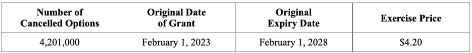 The Company announces the cancellation of an aggregate of 4,201,000 stock options (the “Cancelled Options”) previously held by certain directors, officers, and consultants of the Company.