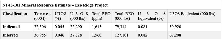 Table 1, Mineral Resource estimate from the technical report entitled “Technical Report on the Eco Ridge Project, Elliot Lake Area, Ontario, Canada – Report for NI 43-101” dated September 14, 2021. The qualified person responsible for preparation of the technical report was Tudorel Ciuculescu, M.Sc., P.Geo., who was independent of the Company at such time. Notes: (1) Mineral Resources were estimated within the Main Conglomerate Bed at a cut-off value of C$72/t. Values calculated in the technical report are based on prices and recoveries of uranium and rare earths, net of off-site rare earth separation costs. (2) Mineral Resources were estimated using an average long-term uranium price of US$55/lb U3O8, a rare earth “basket price” of US$35/kg (net of separation charges), and a C$:US$ exchange rate of 1.25:1.00. (3) U3O8 Equivalents were calculated by converting rare earths values (net of prices, recoveries, and separation charges) to uranium values: (Ce*0.000001615) + (La*0.000001512) + (Nd*0.000083203) + (Pr*0.000086281) + (Sm*0.000001445) + (Eu*0.000026748) + (Gd*0.000034083) + (Sc*0.000873045) + (Y*0.00000438) + (Yb*0.000015265) + (Dy*0.000307606) + (Er*0.000025566) + (Ho*0) + (Lu*0) + (Tb*0.0009556) + (Tm*0) [units of ppm * Canadian dollar]. (4) A minimum mining thickness of 1.8 m was used. (5) TREO include light oxides La2O3, CeO2, Pr6O11, and Nd2O3, and heavy oxides Sm2O3, Eu2O3, Gd2O3, Tb4O7, Dy2O3, Ho2O3, Er2O3, Tm2O3, Yb2O3, Y2O3, and Lu2O3. Sc2O3 is also included, as it occurs in low concentrations and carries high unit values like a HREO. Since the previous NI 43-101 resource estimate, no additional drilling has been conducted at Eco Ridge and there have been no material changes to geological information which could influence the resource estimate.